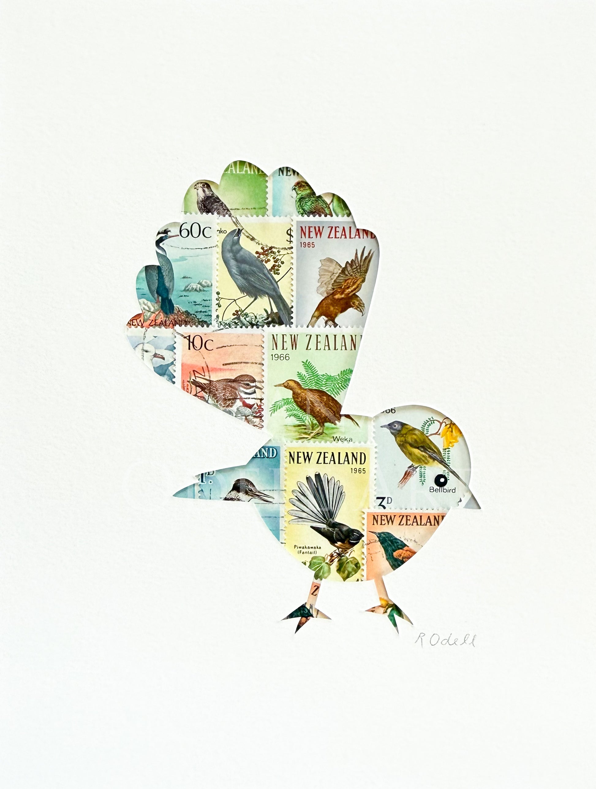 Created from real New Zealand postage stamps featuring birds. Artwork arrives unframed in a cellophane packet with protective backing. Artwork will fit a 6x8 inch frame.