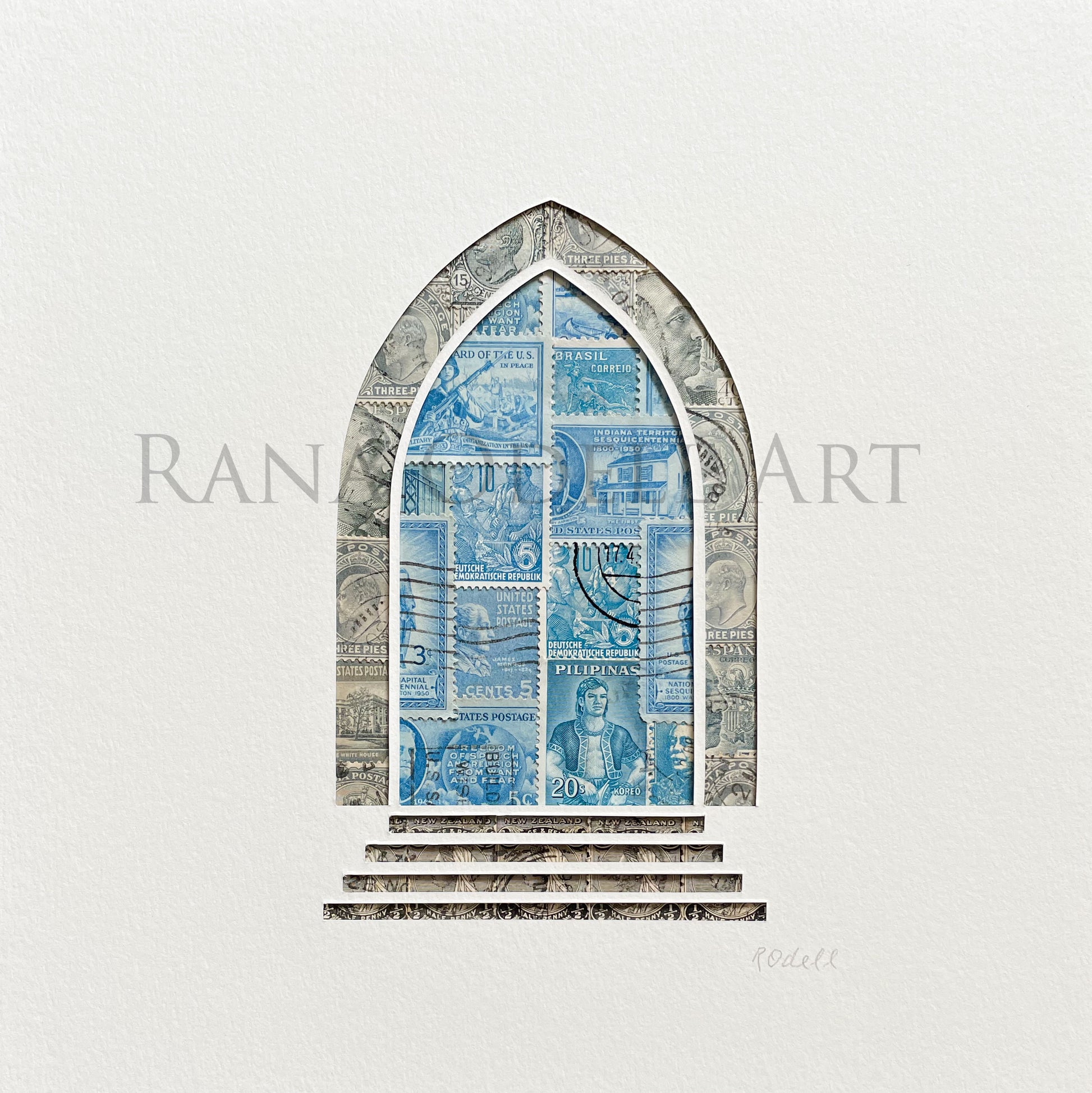 Another commissioned artwork of the church door where the recipient of this piece was married. Created from world postage stamps. This piece was A4 size.