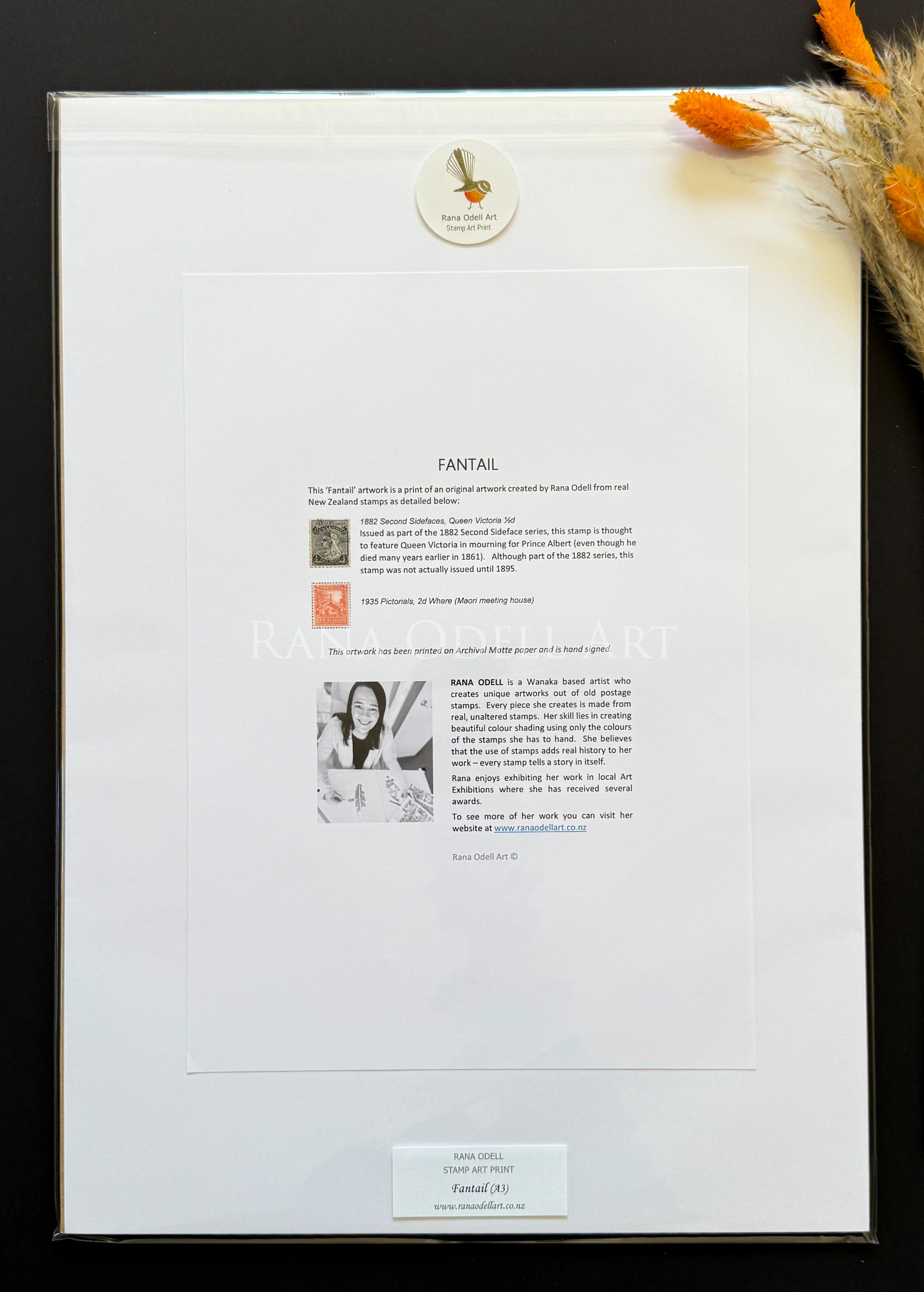 This ‘Fantail’ artwork is a print of an original artwork created by Rana Odell from real stamps.