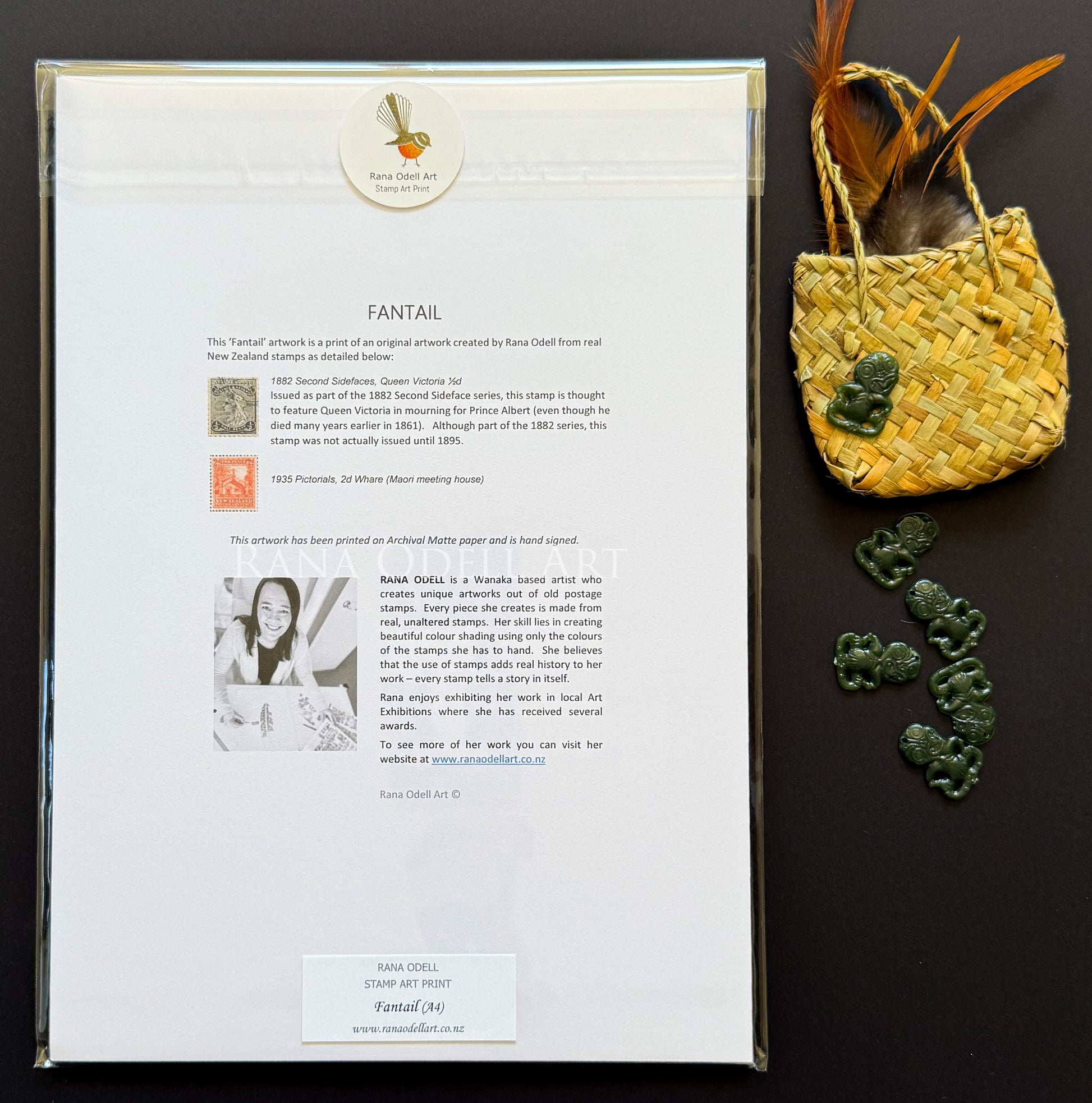 This ‘Fantail’ artwork is a print of an original artwork created by Rana Odell from real stamps.