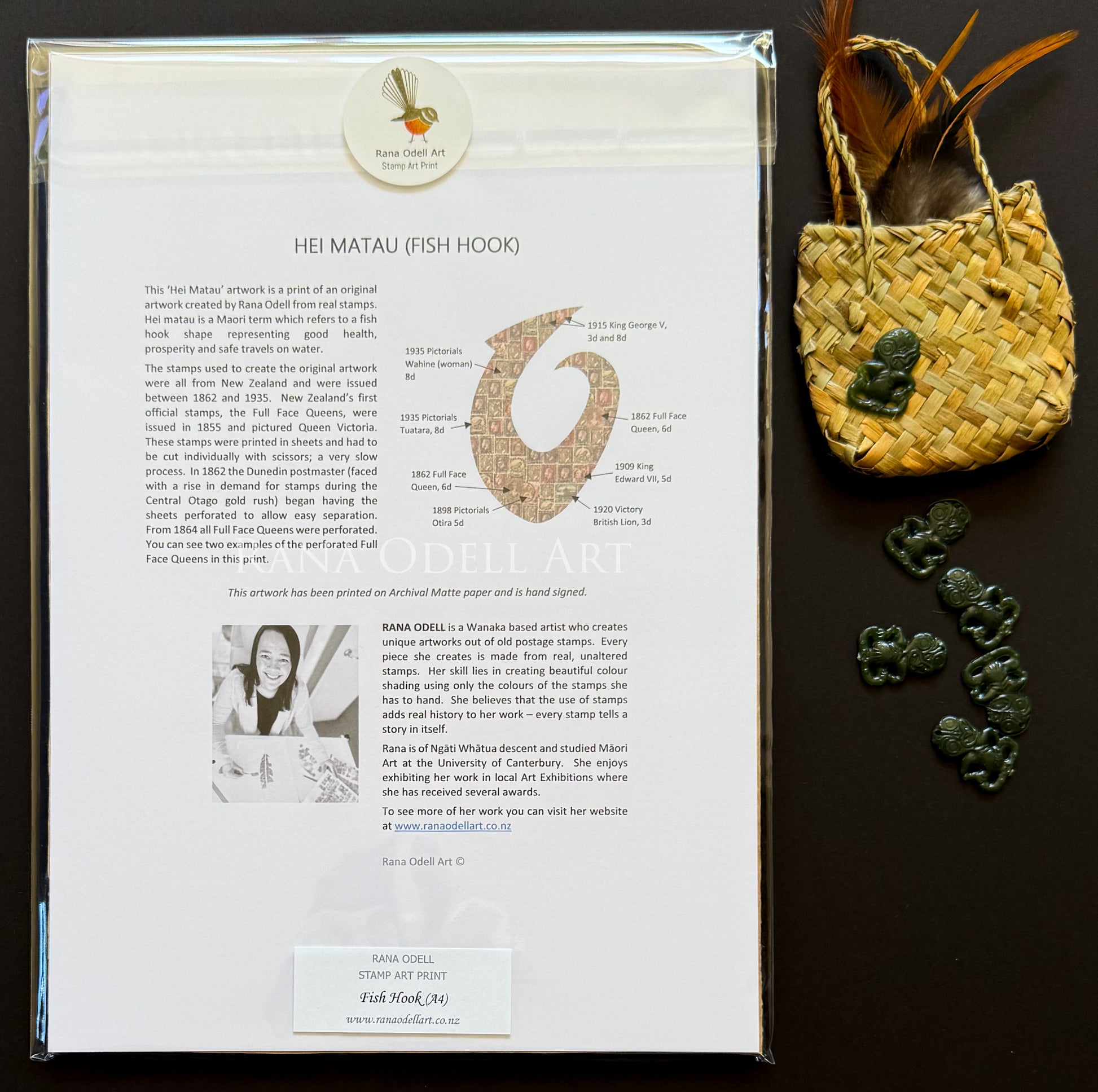 This ‘Fish Hook’ artwork is a print of an original artwork created by Rana Odell from real stamps.