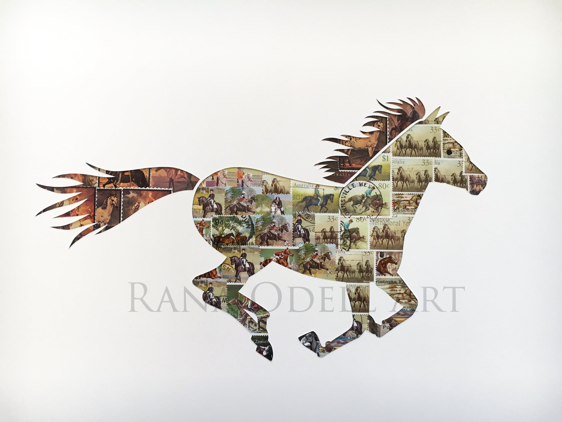 A commissioned piece made entirely from stamps featuring horses. This piece measured 50x40cm.