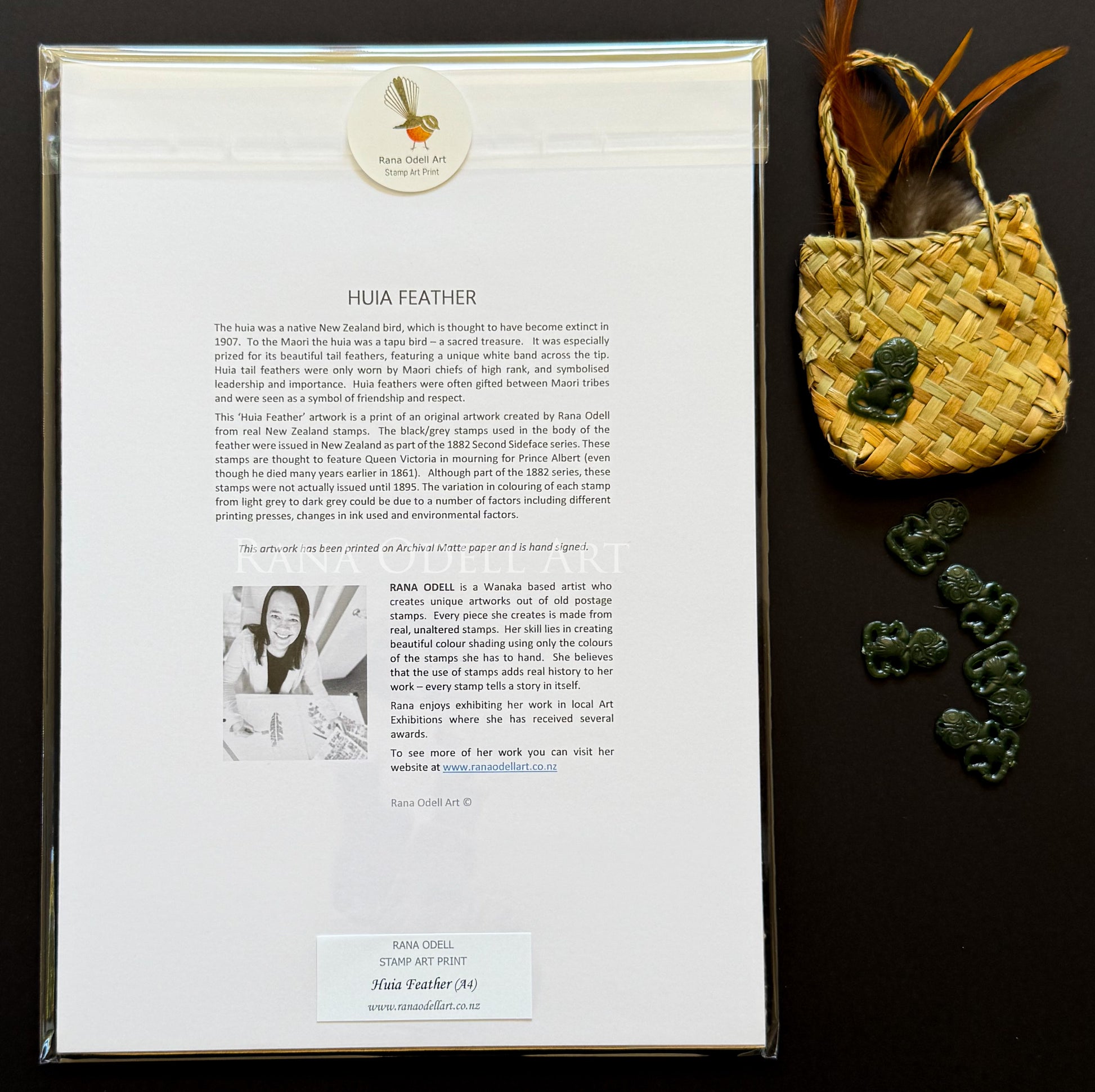 This ‘Huia Feather’ artwork is a print of an original artwork created by Rana Odell from real stamps.
