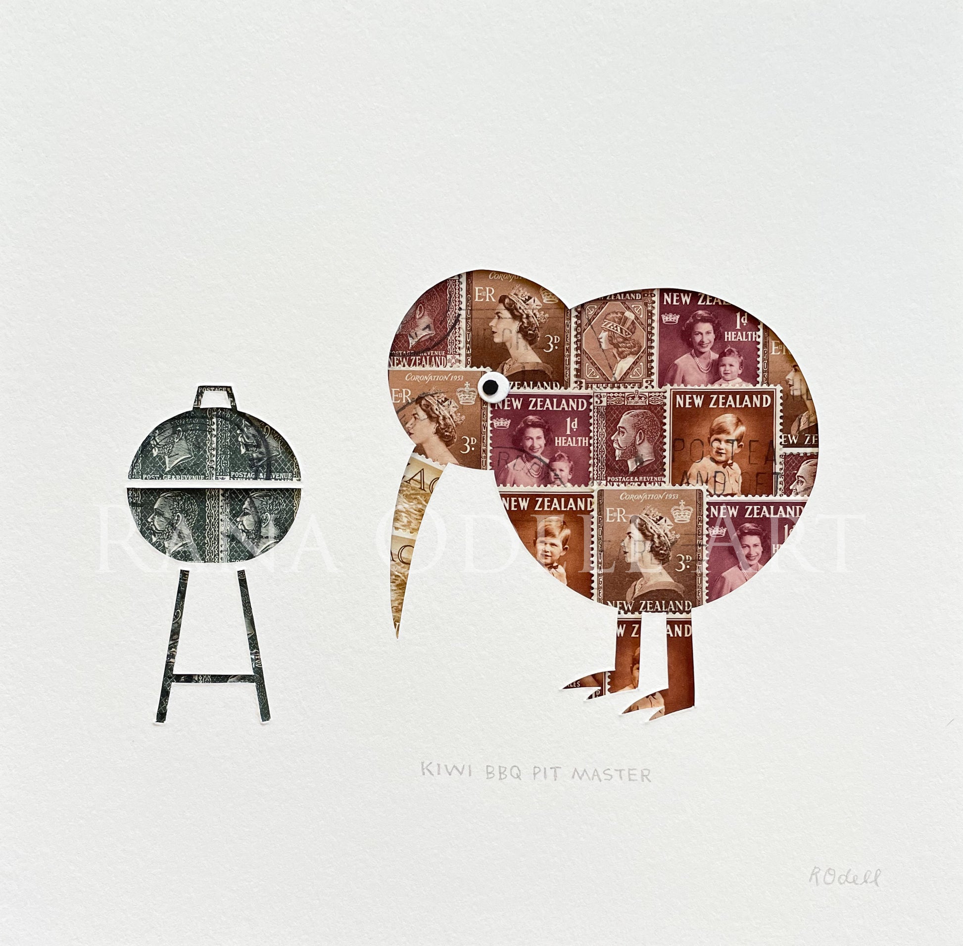 Created from real New Zealand postage stamps issued between 1915 and 1965. Artwork arrives unframed in a cellophane packet with protective backing. Artwork will fit an 8x8 inch frame.