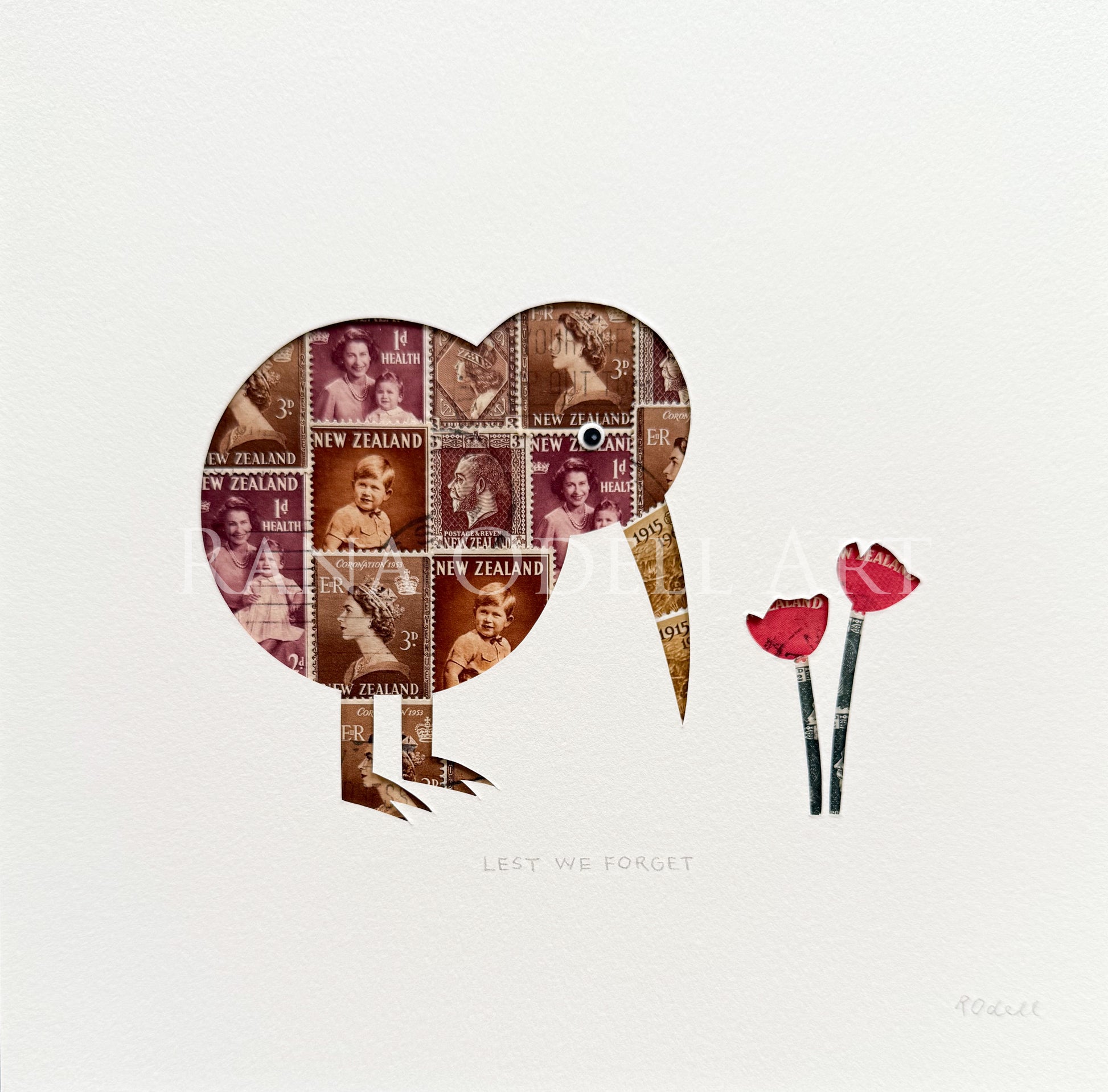 Created from real New Zealand postage stamps issued between 1915 and 1965. Artwork arrives unframed in a cellophane packet with protective backing. Artwork will fit an 8x8 inch frame.
