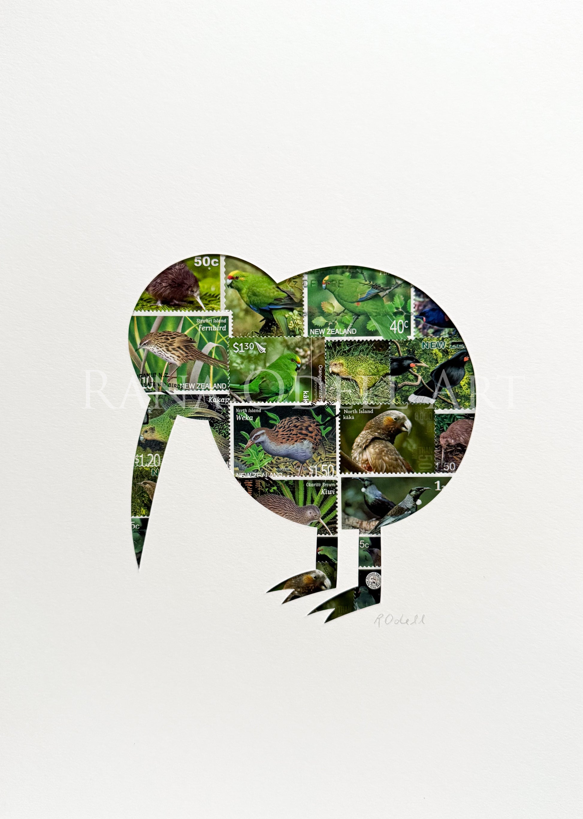 NZ kiwi, created from real New Zealand postage stamps featuring native New Zealand birds. Artwork arrives unframed in a cellophane packet with protective backing. Artwork will fit an A4 frame.