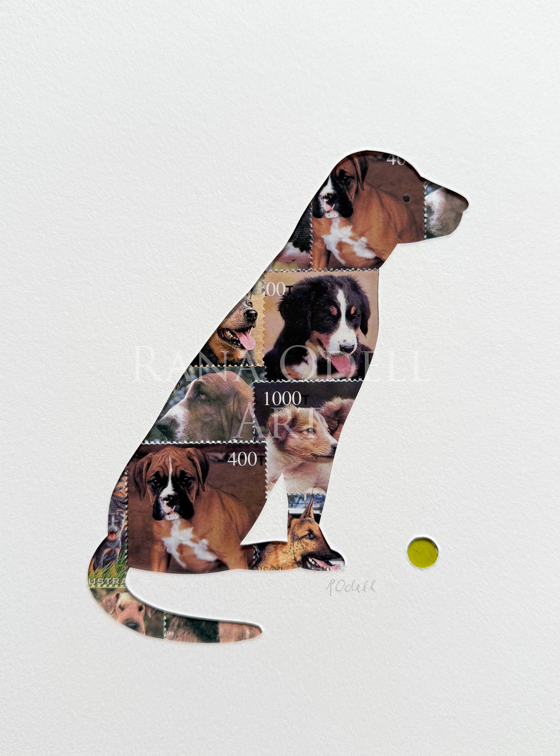 Created from real postage stamps featuring dogs. Stamps originate from around the world. Artwork arrives unframed in a cellophane packet with protective backing. Artwork will fit a 6x8 inch frame.