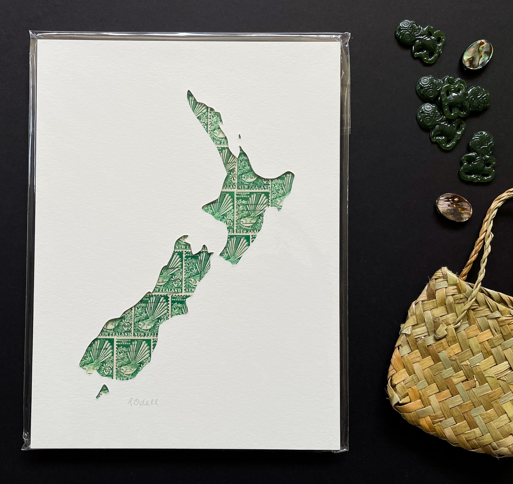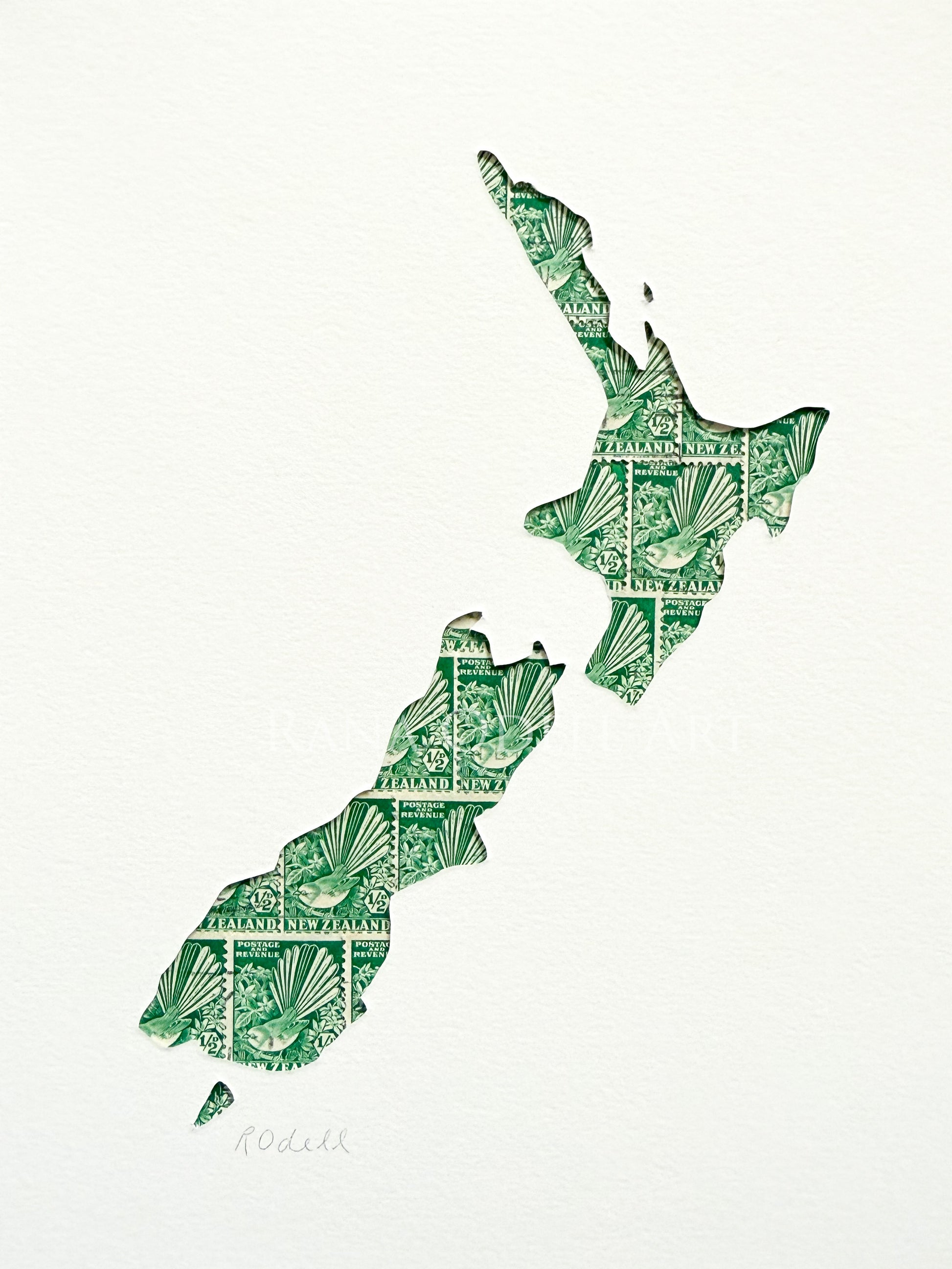 Created from real New Zealand postage stamps issued in 1935 featuring a fantail. Artwork arrives unframed in a cellophane packet with protective backing. Artwork will fit a 6x8 inch frame.