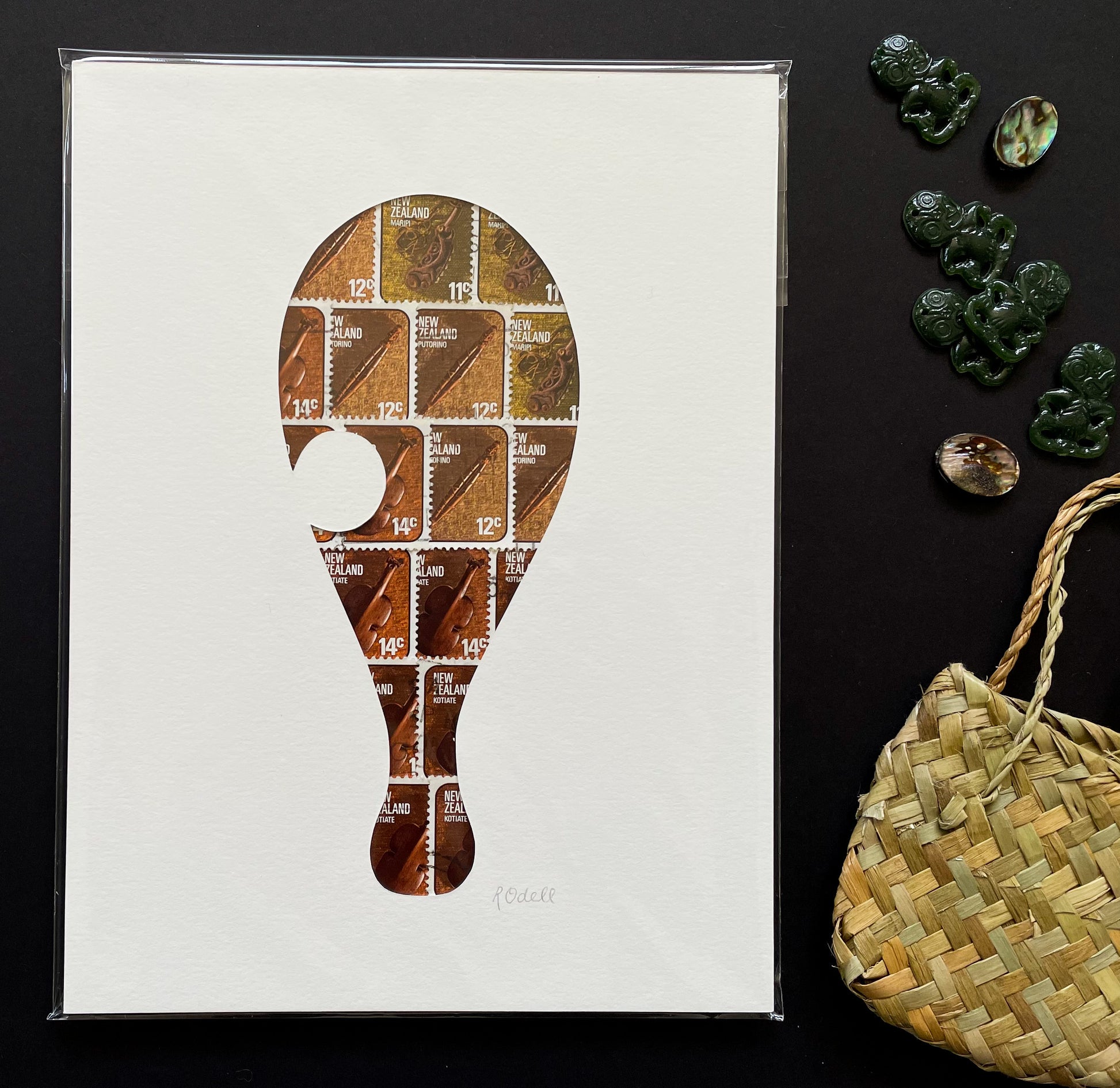 Created from real New Zealand postage stamps featuring Māori artefacts issued in 1980. Artwork arrives unframed in a cellophane packet with protective backing. Artwork will fit a 6x8 inch frame.