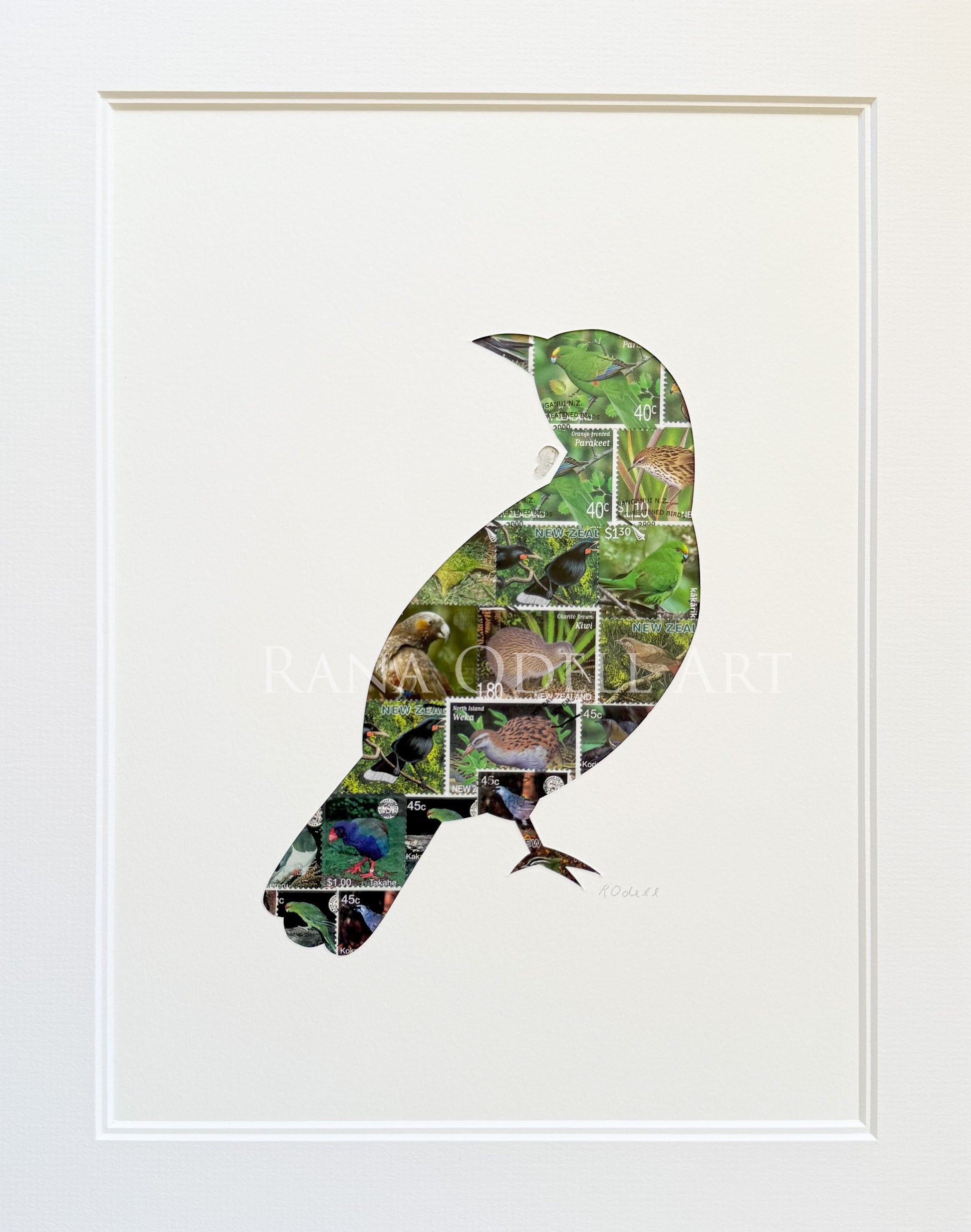 Created from real New Zealand postage stamps featuring native birds. Artwork arrives unframed in a cellophane packet with protective backing. Includes the double mat border shown in the image. Artwork will fit an 11x14 inch frame.