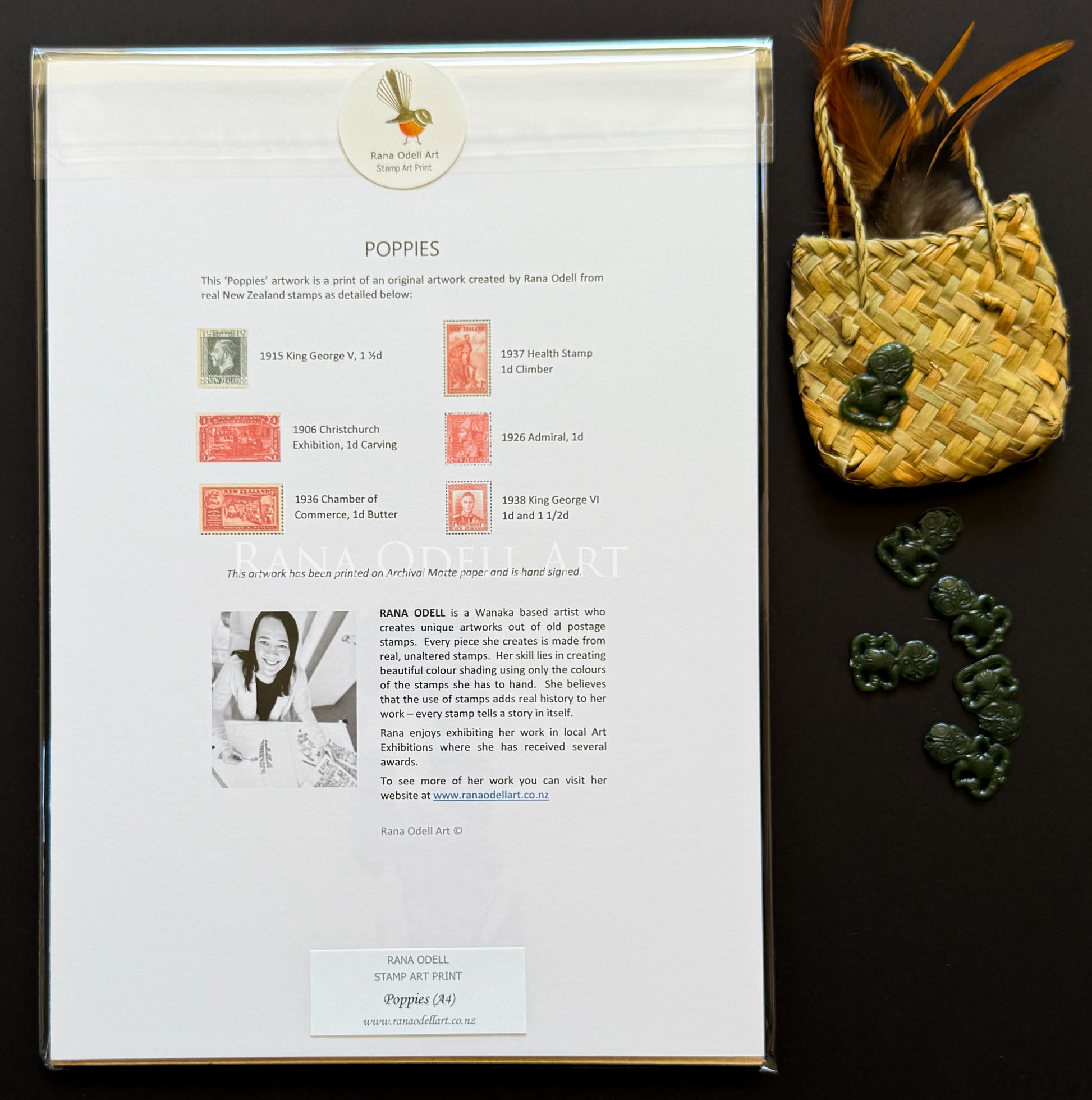 This ‘Poppies’ artwork is a print of an original artwork created by Rana Odell from real stamps.