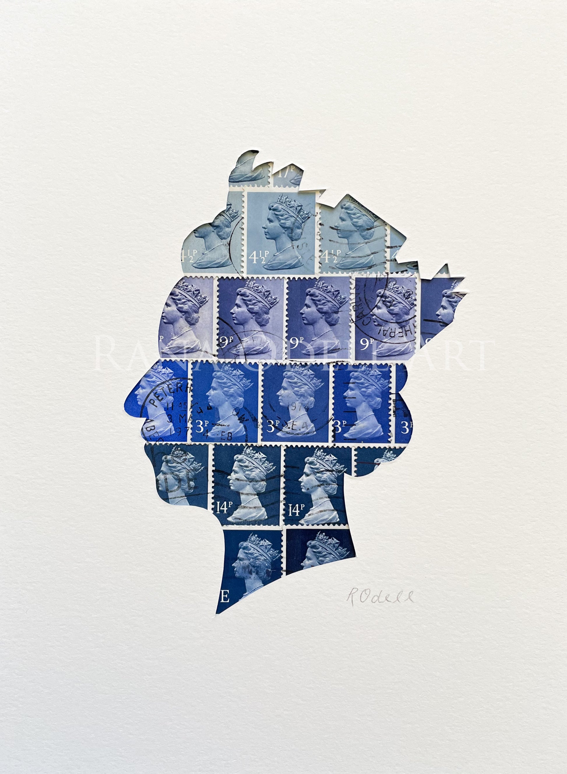 Created from real UK postage stamps featuring Queen Elizabeth II. Artwork arrives unframed in a cellophane packet with protective backing. Will fit a 6x8 inch frame.