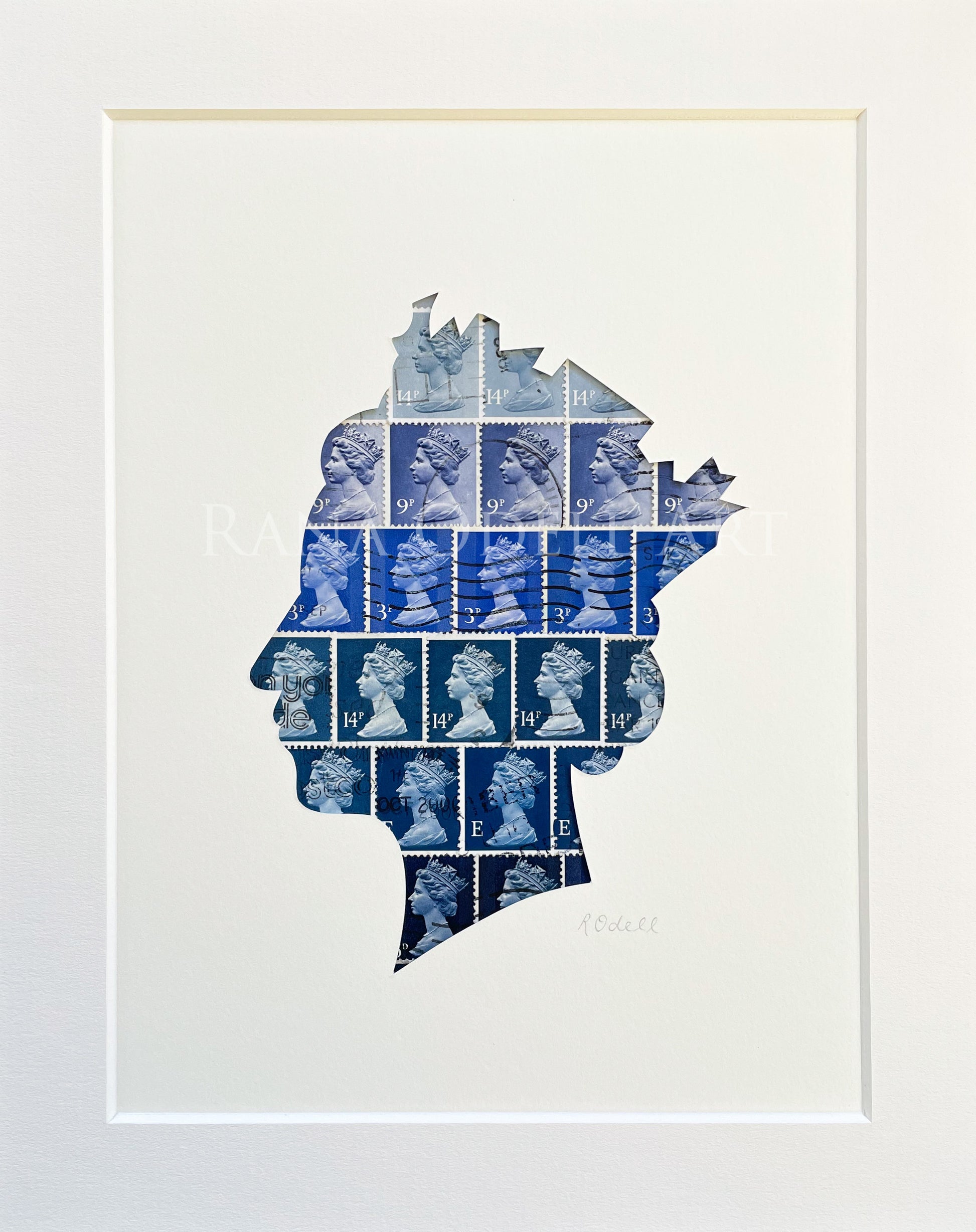 Created from real UK postage stamps featuring Queen Elizabeth II. Artwork arrives unframed in a cellophane packet with protective backing. Includes the white mat border shown in the image. Will fit an 8x10 inch frame.