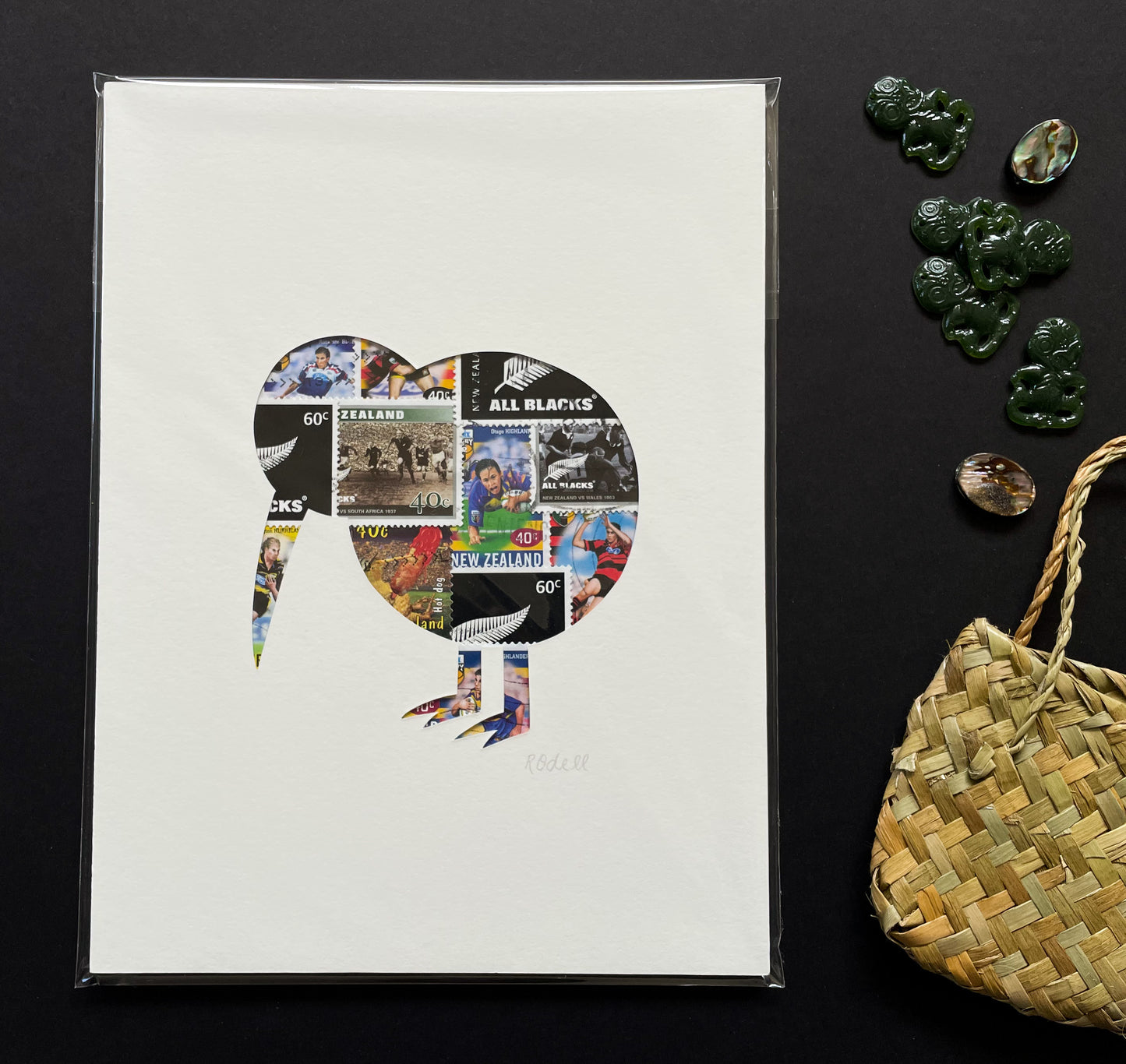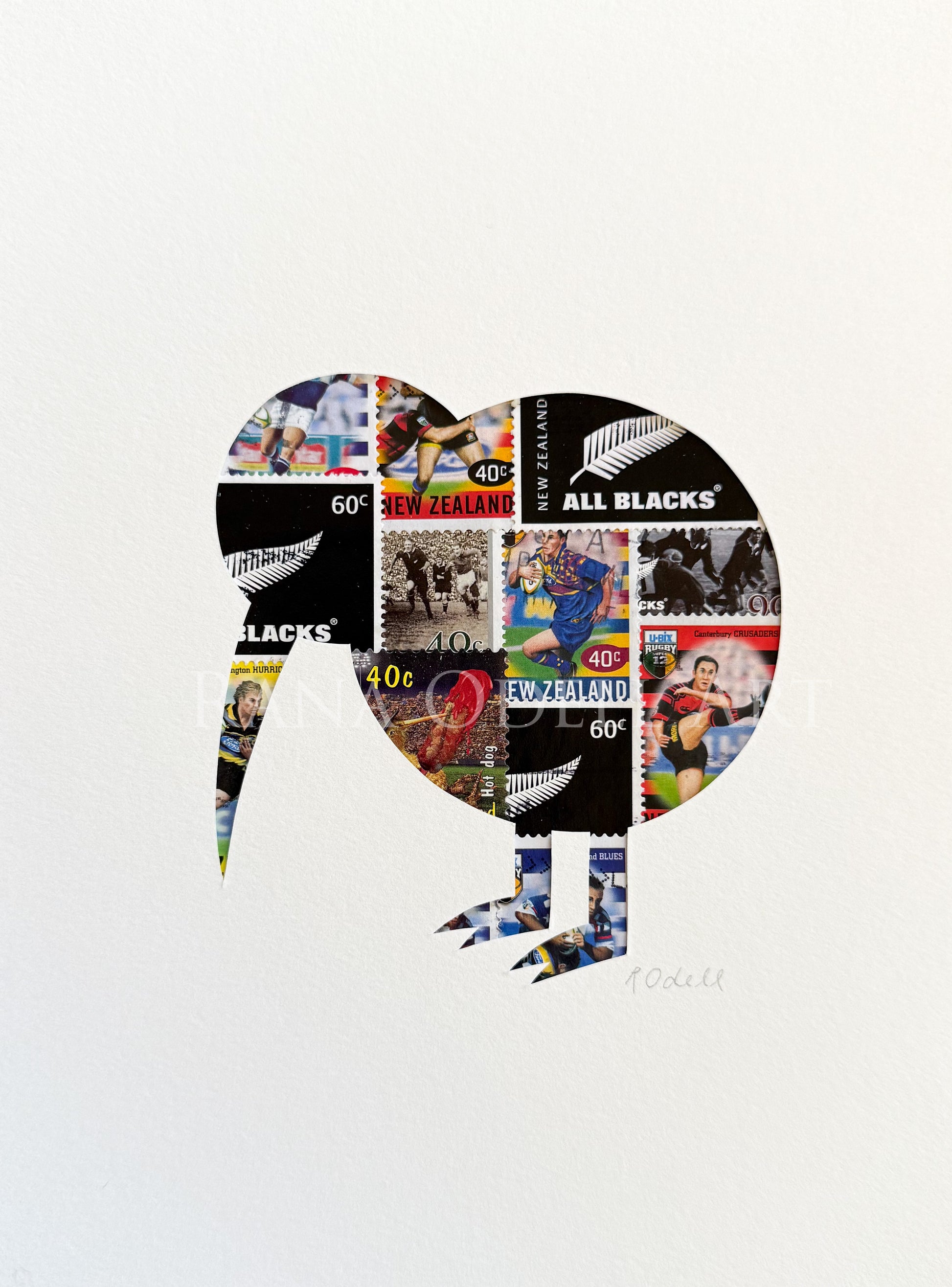 Created from real New Zealand postage stamps featuring rugby themes. Artwork arrives unframed in a cellophane packet with protective backing. Artwork will fit a 6x8 inch frame.
