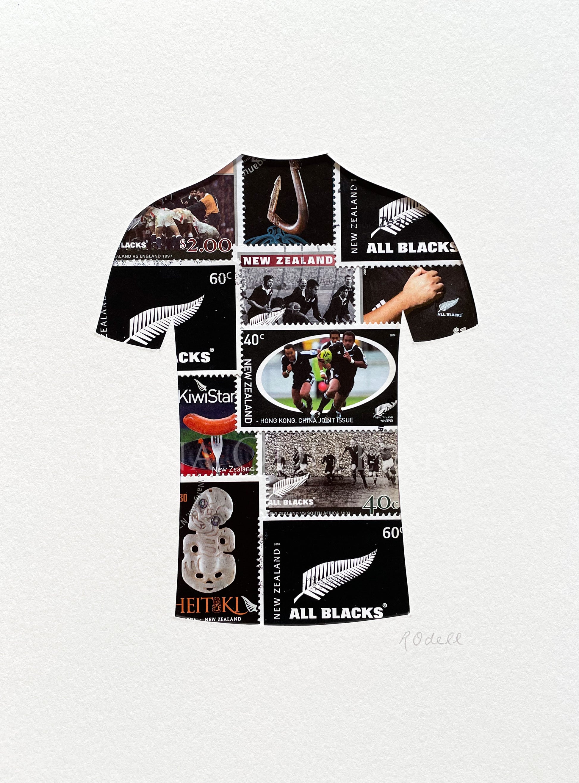 Created from real New Zealand postage stamps featuring rugby/NZ themes. Artwork arrives unframed in a cellophane packet with protective backing. Artwork will fit a 6x8 inch frame.