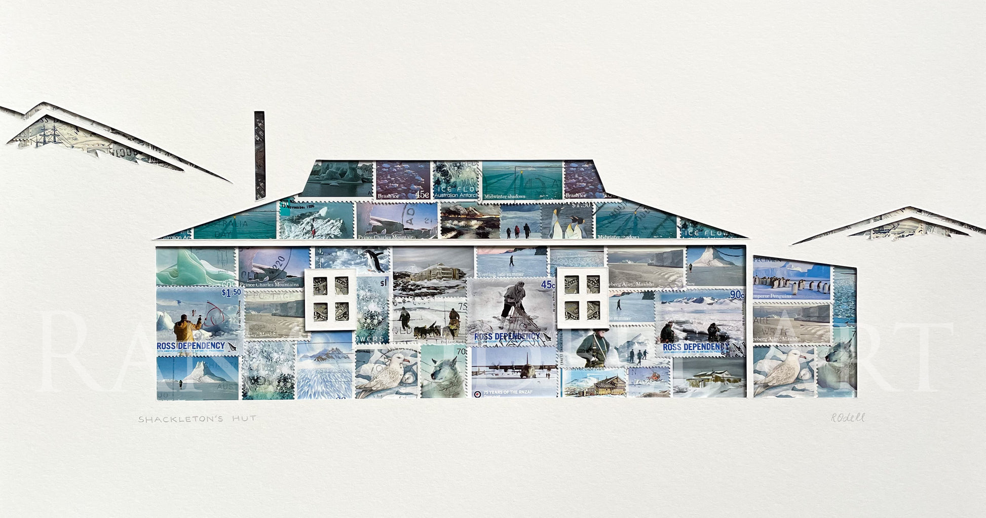 A special commission made from postage stamps featuring Antarctic scenes. The building is Shackleton’s Hut, which has great meaning for the recipient who helped to restore this hut when he was younger.