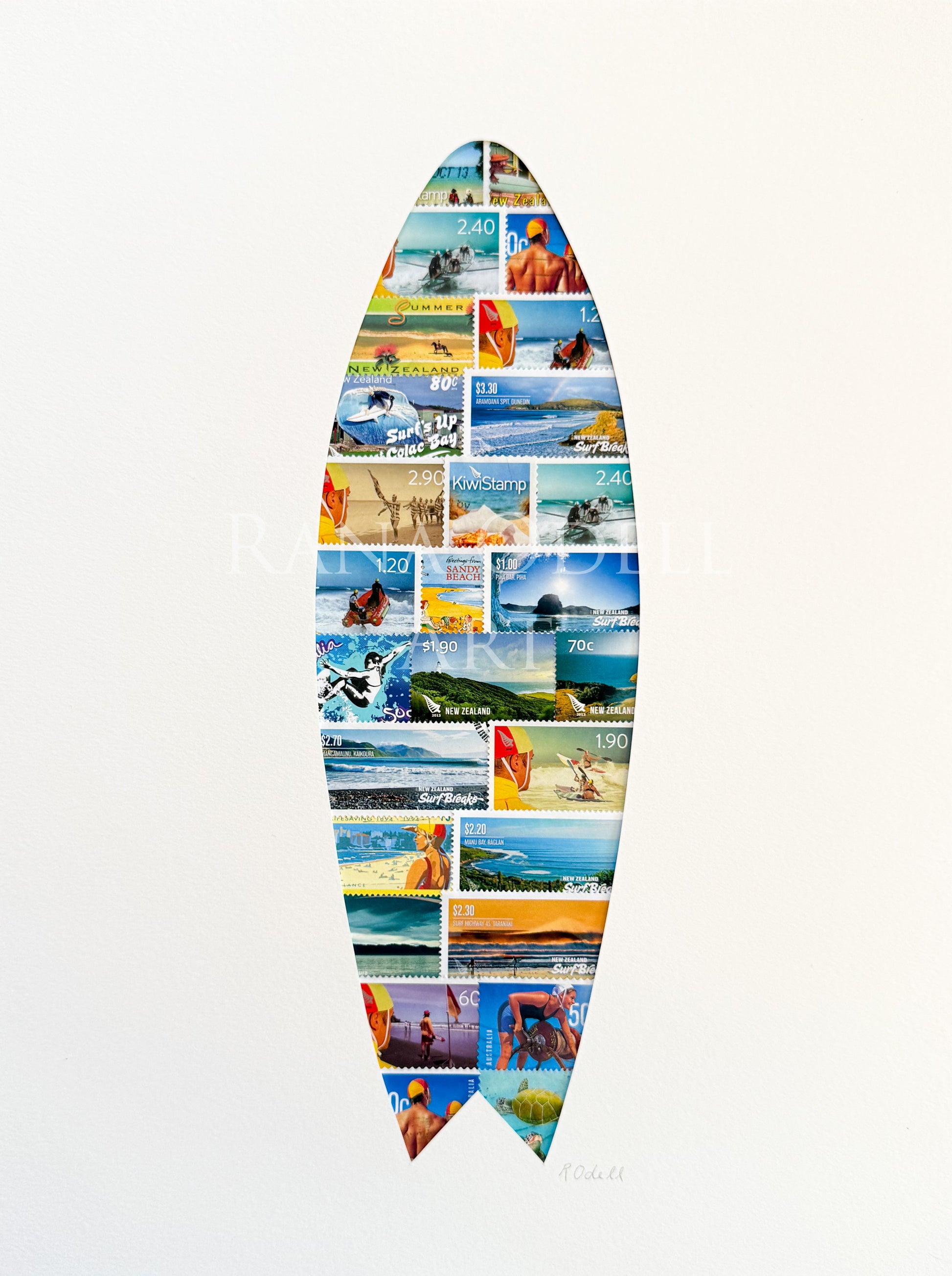 Created from real New Zealand and Australian postage stamps featuring surfing / beach themes. Artwork arrives unframed in a cellophane packet with protective backing. Artwork will fit an 11x13 inch frame.