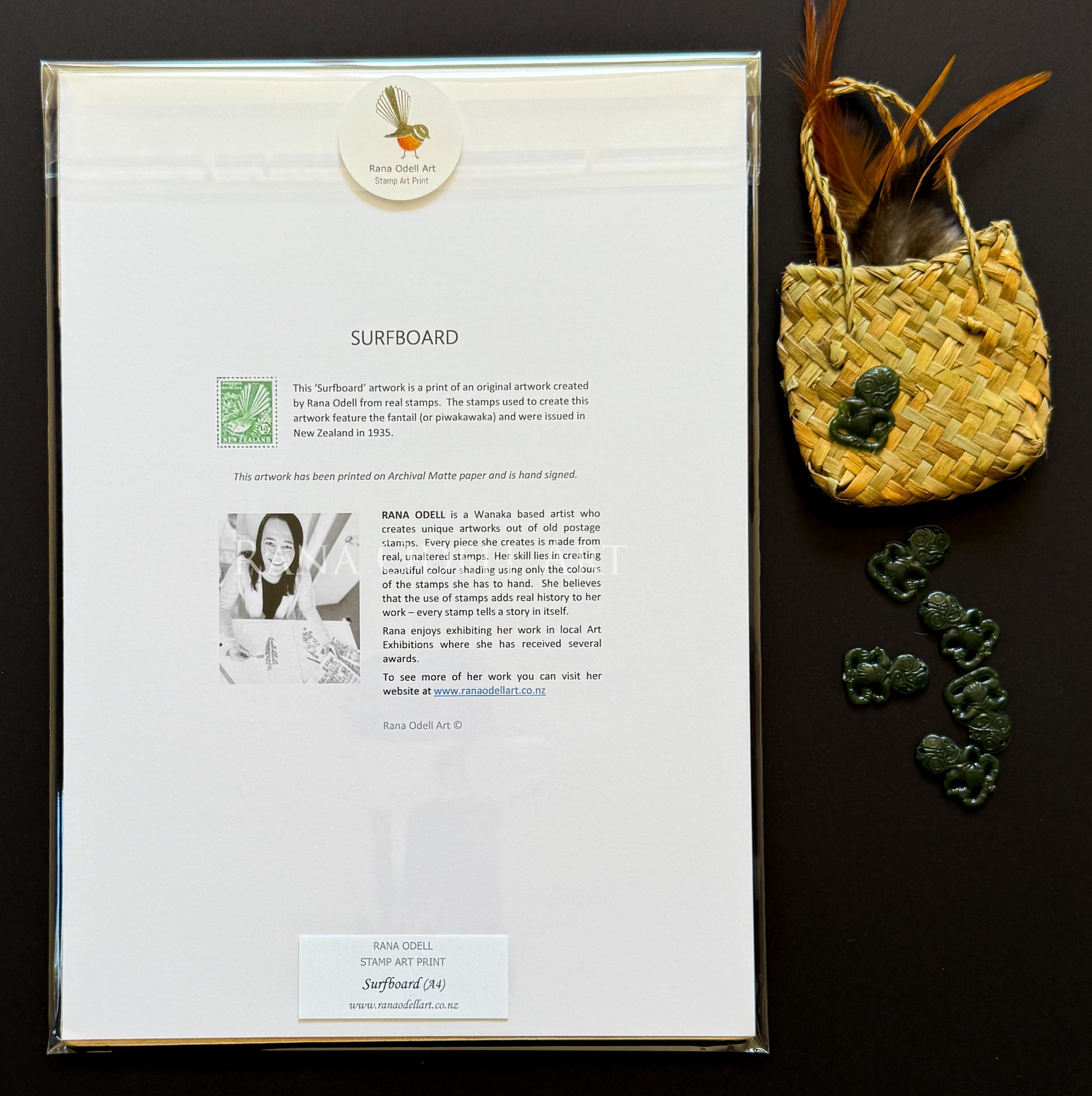 This ‘Surfboard’ artwork is a print of an original artwork created by Rana Odell from real stamps.