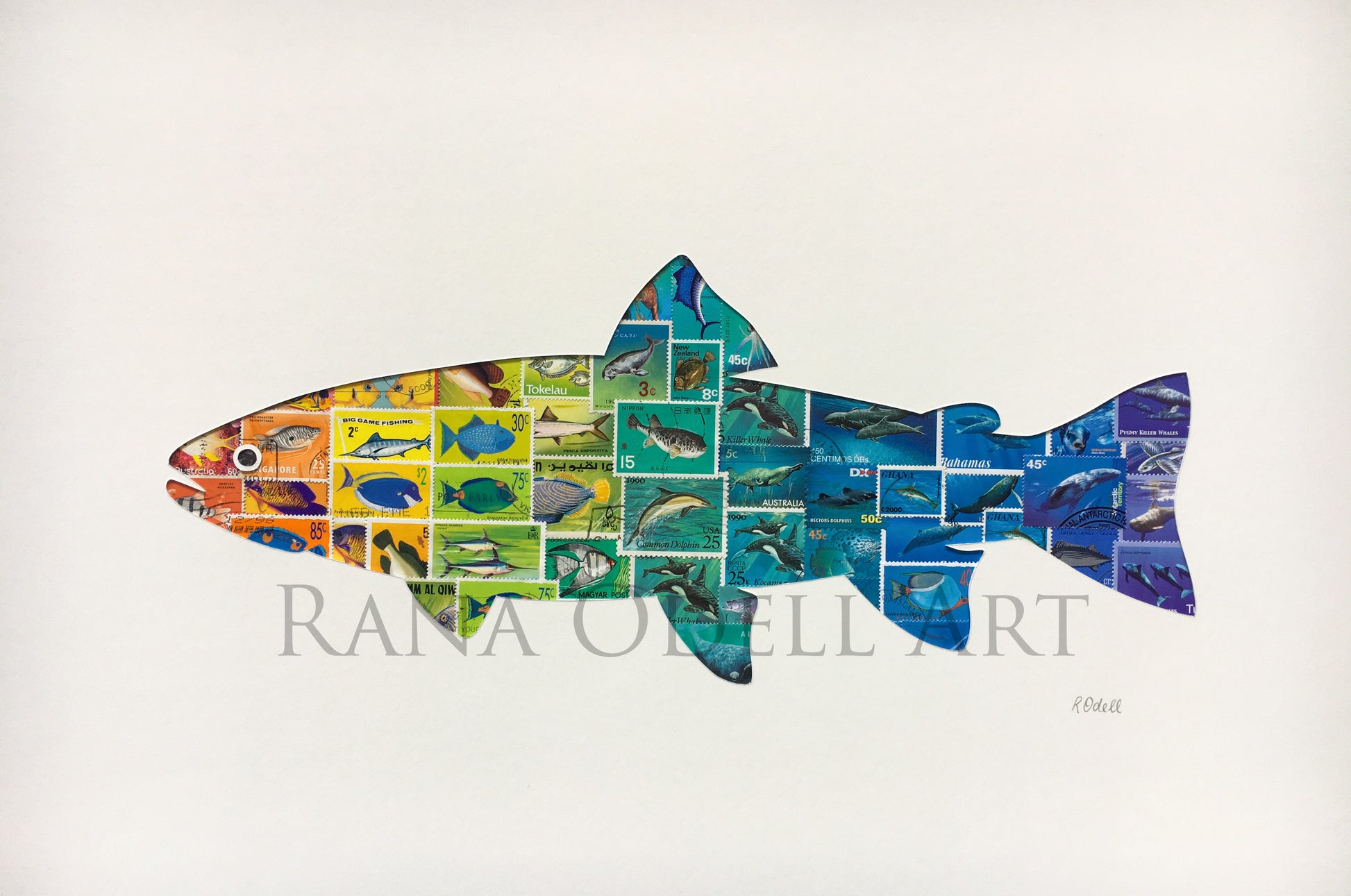 Created from real postage stamps featuring fish. This piece measured 50x40cm.