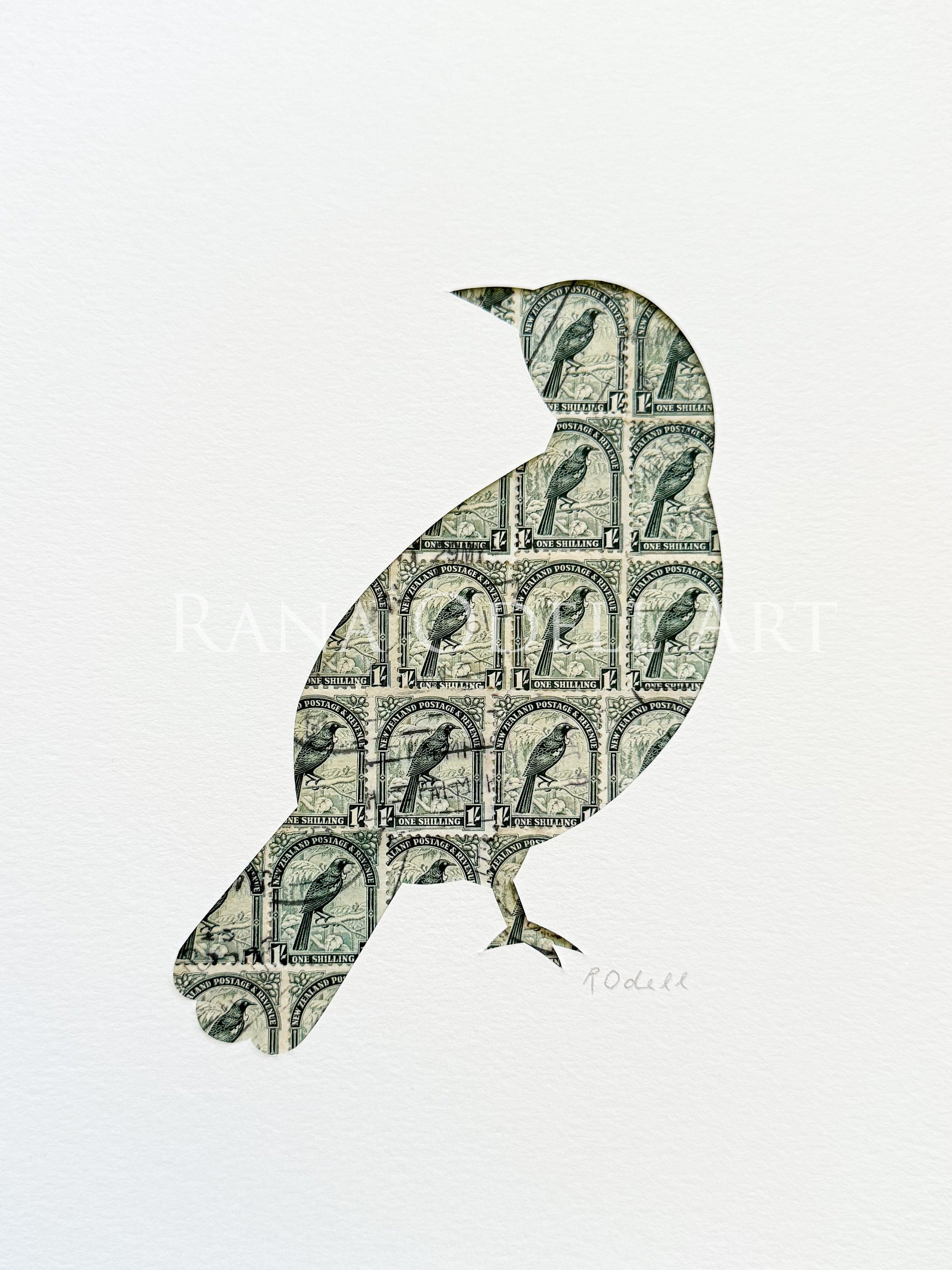 Created from real New Zealand postage stamps featuring tuis issued in 1935. Artwork arrives unframed in a cellophane packet with protective backing. Artwork will fit a 6x8 inch frame.